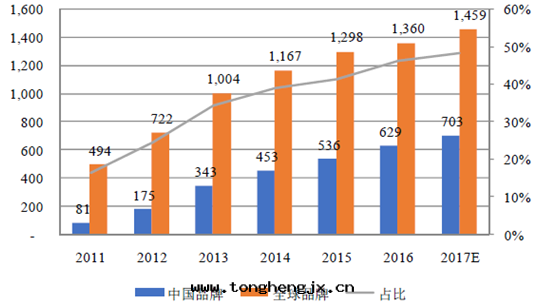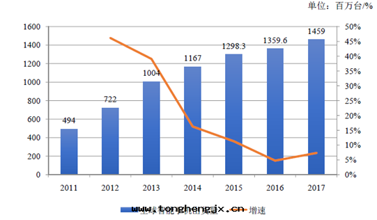 2011-2017 年(nián)中國(guó)智能(néng)手(shǒu)機(jī)出貨量(liàng)預測(單位(wèi):百(bǎi)万(wàn)台(tái)/%)