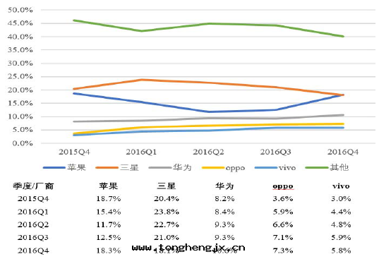 2016 年(nián)第(dì)四(sì)季度,三(sān)星(xīng)和(hé)蘋果在(zài)全(quán)球市(shì)场(chǎng)的占有(yǒu)率已從2013 年(nián)的超过(guò)50%降低(dī)至(zhì)36.4%,與(yǔ)之(zhī)相对(duì)应的,華为(wèi)、OPPO、VIVO 三(sān)家(jiā)公(gōng)司在(zài)全(quán)球市(shì)场(chǎng)的合計(jì)份額已從2015 年(nián)第(dì)四(sì)季度的14.8%上(shàng)升(shēng)到(dào)23.7%,呈現(xiàn)快(kuài)速上(shàng)升(shēng)的趨勢。