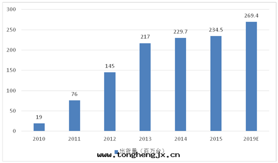 2010-2015 年(nián)及(jí)2019E 年(nián)全(quán)球平闆電(diàn)腦出貨量(liàng)及(jí)預測