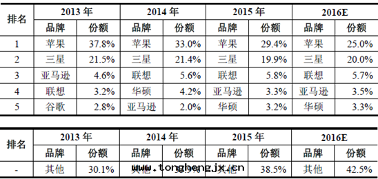 2013-2016 年(nián)平闆電(diàn)腦前(qián)五(wǔ)大(dà)品牌市(shì)场(chǎng)排名(míng)