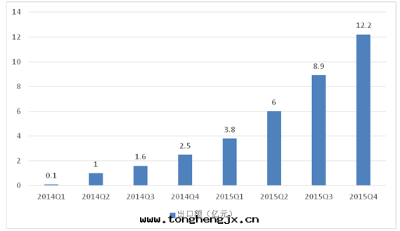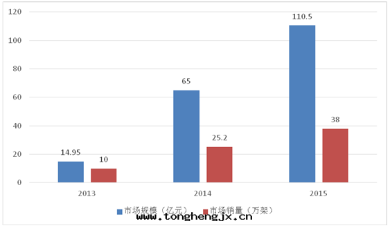 目前(qián)無人(rén)機(jī)市(shì)场(chǎng)銷量(liàng)最(zuì)大(dà)的为(wèi)消費級無人(rén)機(jī),消費級無人(rén)機(jī)近(jìn)幾(jǐ)年(nián)来(lái)高(gāo)速增长(cháng),全(quán)球市(shì)场(chǎng)需求旺盛。全(quán)球消費級無人(rén)機(jī)銷量(liàng)從2013 年(nián)的10 万(wàn)架增长(cháng)到(dào)2015年(nián)的約38 万(wàn)架,市(shì)场(chǎng)規模從2013 年(nián)的14.95 亿(yì)元增长(cháng)至(zhì)2015 年(nián)的110.50 亿(yì)元,年(nián)複合增长(cháng)率为(wèi)171.87%。中國(guó)消費級無人(rén)機(jī)出口(kǒu)同(tóng)样增长(cháng)迅速,深圳海(hǎi)關(guān)出口(kǒu)數據(jù)顯示,深圳海(hǎi)關(guān)消費級無人(rén)機(jī)出口(kǒu)額從2014 年(nián)一(yī)季度的0.1 亿(yì)元,增长(cháng)到(dào)2015 年(nián)四(sì)季度的12.2 亿(yì)元,实現(xiàn)了(le)急速的增长(cháng)。