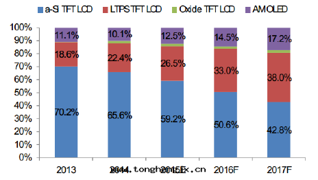 2013-2017 年(nián)全(quán)球手(shǒu)機(jī)顯示模組分(fēn)技術(shù)出貨比重(zhòng)