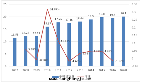 數據(jù)顯示,2013 年(nián)至(zhì)2015 年(nián)全(quán)球手(shǒu)機(jī)出貨量(liàng)分(fēn)别为(wèi)18 亿(yì)部(bù)、18.9 亿(yì)部(bù)和(hé)19.8 亿(yì)部(bù)。2016 年(nián)全(quán)球手(shǒu)機(jī)出貨量(liàng)小幅下(xià)降,全(quán)年(nián)約19.5 亿(yì)部(bù),預計(jì)2020年(nián)全(quán)球手(shǒu)機(jī)出貨量(liàng)上(shàng)升(shēng)至(zhì)20.1 亿(yì)部(bù)。
