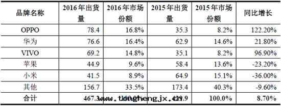 2016 年(nián)中國(guó)智能(néng)手(shǒu)機(jī)市(shì)场(chǎng)各(gè)品牌市(shì)场(chǎng)份額(單位(wèi):百(bǎi)万(wàn)台(tái)/%)