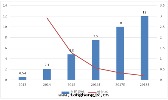 我(wǒ)國(guó)可(kě)穿戴設備市(shì)场(chǎng)規模迅速扩大(dà), 2014 年(nián)市(shì)场(chǎng)進(jìn)入(rù)深入(rù)試探期(qī),中國(guó)可(kě)穿戴設備市(shì)场(chǎng)交易規模达到(dào)26.50 亿(yì)元,2015 年(nián)市(shì)场(chǎng)交易規模急劇扩大(dà)到(dào)136.80 亿(yì)元,增速高(gāo)达416.20%,預計(jì)2016 年(nián)至(zhì)2018 年(nián)仍保持(chí)较高(gāo)速增长(cháng)。